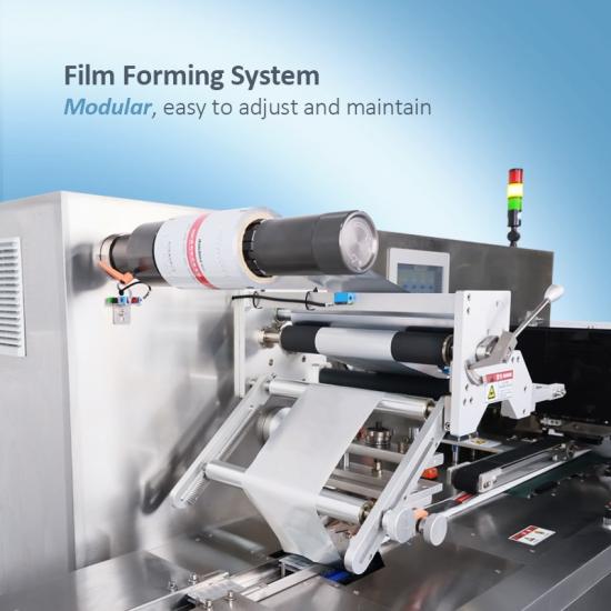 Точные сервоуправляемые операции: система использует сервомеханизмы для подачи, протяжки, размотки и резки плёнки. Длина пакета точно контролируется серводвигателями, а регулировка скорости подачи, размотки и резки плёнки автоматизирована, что обеспечивает превосходную стабильность.