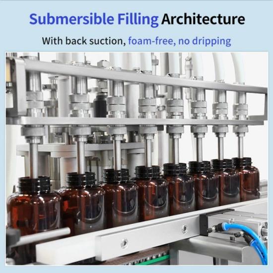 Наполнение с погружением снизу является одной из его основных особенностей. Во время процесса наполнения наполнительная головка всегда находится ниже уровня жидкости. Такая конструкция искусно решает проблему вспенивания и разбрызгивания жидкости. Для некоторых легко вспенивающихся жидкостей, таких как жидкости, содержащие поверхностно-активные вещества, и некоторых жидкостей для приема внутрь, традиционный метод наполнения легко наполняется выше уровня жидкости, что вызывает бурный контакт между жидкостью и воздухом, приводящий к образованию большого количества пузырьков. Эти пузырьки не только занимают пространство контейнера, влияют на точность объема наполнения, но и могут переливаться через край контейнера, приводя к жидким отходам и загрязнению оборудования. Однако при наполнении с погружением снизу, поскольку наполнительная головка находится глубоко под уровнем жидкости, жидкость может плавно впрыскиваться в контейнер, что значительно снижает контакт с воздухом и принципиально подавляет образование пузырьков. В то же время это также предотвращает разбрызгивание жидкости из контейнера из-за удара, что еще больше снижает потери жидкости.